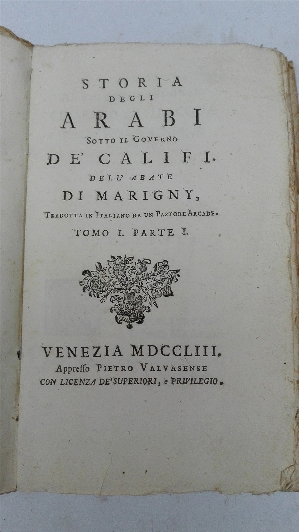 DE MARIGNY, Francois Augier. Storia degli arabi sotto il governo de' califi. Venezia (prima edizione italiana). Pietro Valvasense, 1753-54. 8 volumi in 8vo, esemplare in barbe. Legatura coeva cartonata (lievi difetti).