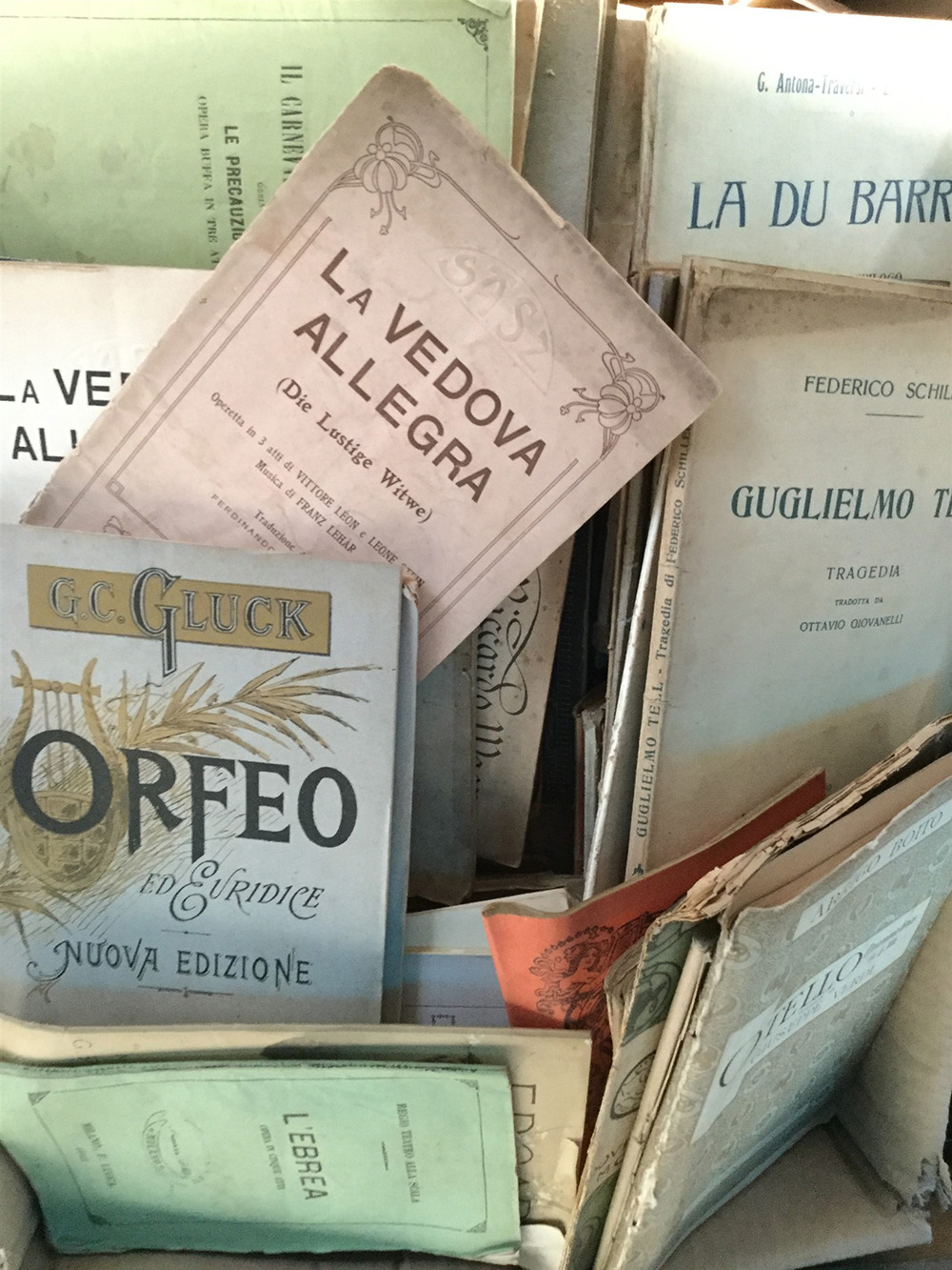 Lotto di due cartoni contenenti numerosi volumi, principalmente spartiti musicali e libretti d’opera