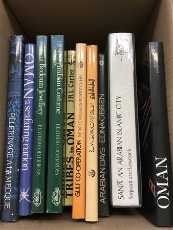 Lotto composto da numerosi volumi relativi i diversi aspetti socio-culturali del vicino e del medio Oriente e dell'Africa, come i costumi e i gioielli delle popolazioni arabe e beduine, le rotte carovaniere, i mercanti e i commerci. Totale di 50 opere in quattro cartoni.