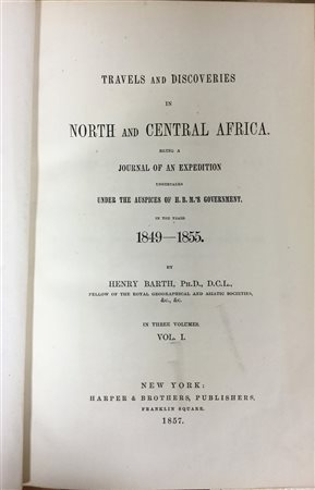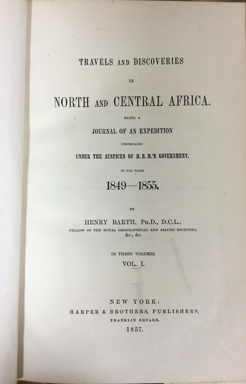 BARTH, Henry. Travels and Discoveries in North and Central Africa. New York: Harper & Brothers, 1857-58.