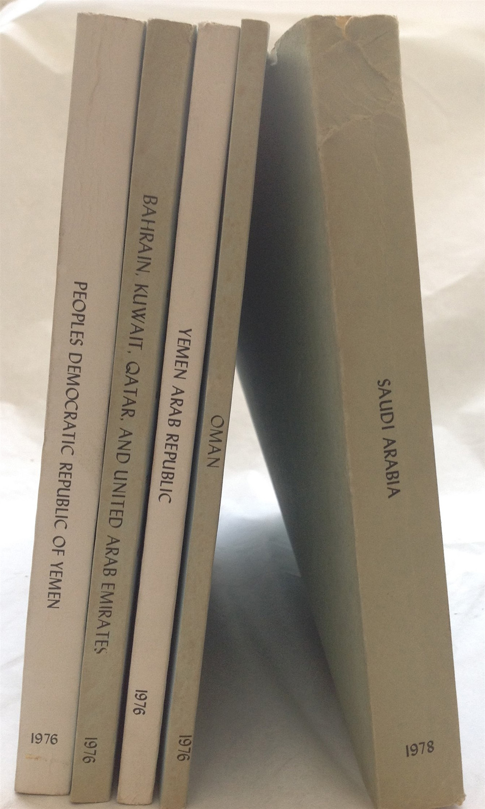 Lotto composto da cinque pubblicazioni della Official Standard Names Gazetteer relative ai territori di Yemen, Oman, Bahrain, Kuwait, Qatar, Emirati Arabi, Arabia Saudita, preparati dal Defense Mapping Agency Topographic Center (1976) (lievi difetti).