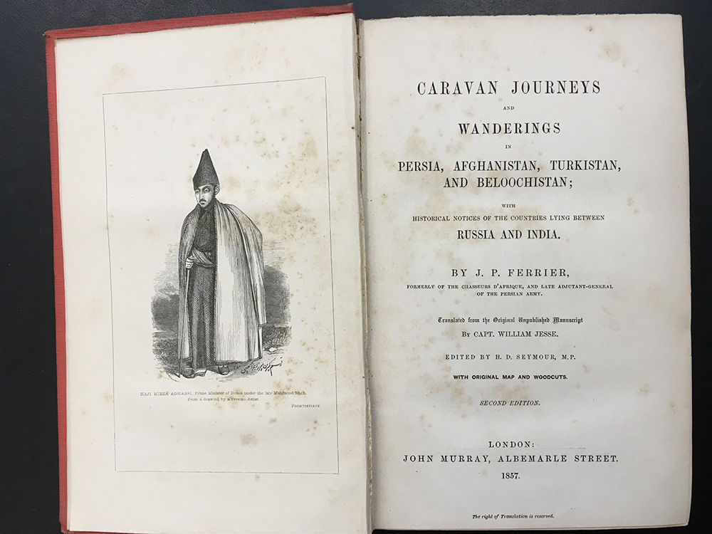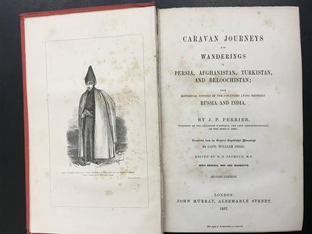 FERRIER, Jean Pierre. Caravan Journeys And Wanderings In Persia, Afghanistan, Turkistan, And Beloochistan. Londra: John Murray, 1857. Vol. in 8vo, con una carta geografica ripiegata in fine (fioriture). Legatura in piena tela rossa (lievi difetti).