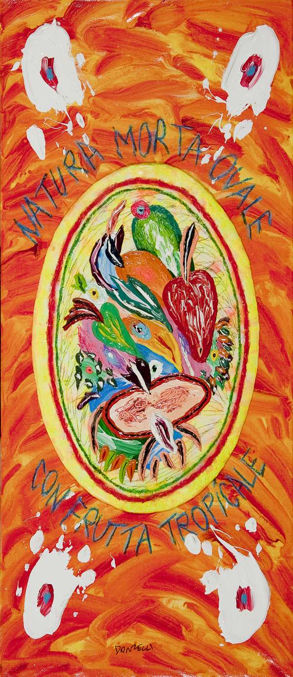 Bruno Donzelli Natura morta ovale con frutta Firma in basso al centro tropicale olio, tecnica mista su tela cm. 70x30