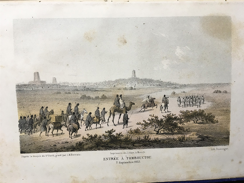 BARTH, Henri. Voyages et découvertes dans l’Afrique septentrionale et centrale pensant les années 1849 à 1855. Parigi, Bruxelles e Lipsia: A. Bohné, F. Van Meenen e Alphonse Durr, 1860-61. 4 voll. in 8vo, con ritratto dell’autore in antiporta nel primo volume e numerose illustrazioni e tavole fuori testo (sporadiche fioriture). Legatura in piena tela blu con autore e titolo in oro al dorso (lievi difetti).
