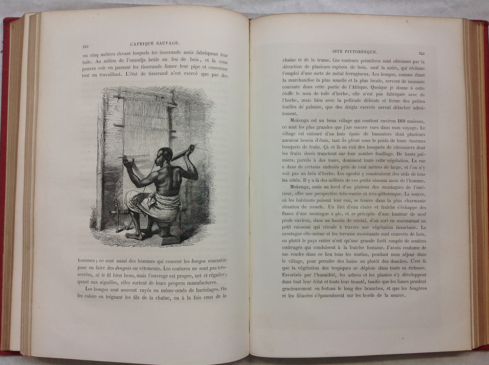 CHALLU, Paul du. L'Afrique sauvage. Parigi: Fratelli Michel Levy, 1868. Volume in 4to, con numerose illustrazioni (lievi fioriture). Legatura in piena tela rossa, con autore e titolo in oro al dorso, taglio dorato (lievi difetti).