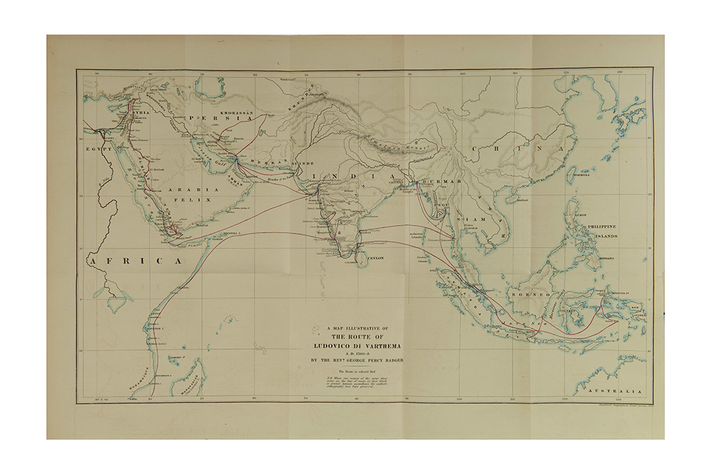 VARTHEMA, Ludovico di; JONES, John Winter (trans). The travels of Ludovico di Varthema in Egypt, Syria, Arabia, Deserta, Persia, India, and Ethiopia, A.D. 1503-1508. Translated from the Original Italian of 1510. Londra: Hakluyt Society, 1863. Un volume. Provenienza H.A. Laylard (ex libris e dedica da parte di:) - Edelin? (datata 1864).