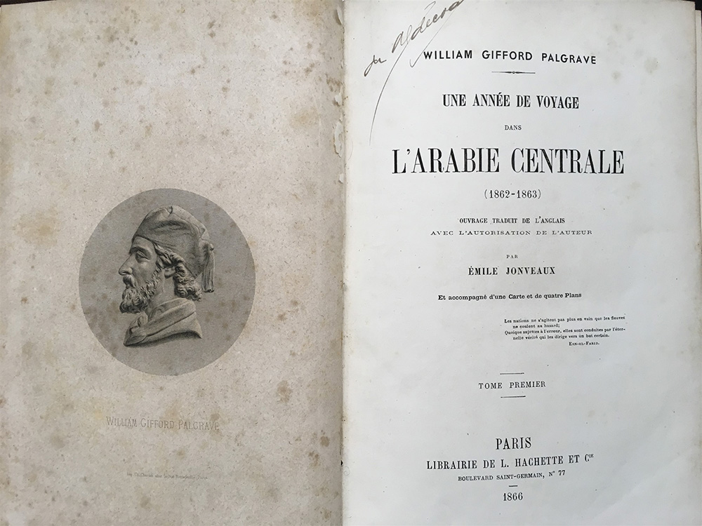 PALGRAVE, William Gifford. Une Année de Voyage dans l’Arabie Centrale (1862-1863). Parigi: Librairie Hachette, 1866. 2 voll. in 4to, con ritratto dell’autore in antiporta sul primo volume (fioriture). Legatura coeva in mezza pelle (lievi difetti).