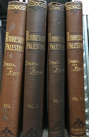 WILSON, Charles Sir. Picturesque Palestine. Sinai and Egypt. Londra: J.S. Virtue and Co., [s.d.]. 4 voll. in folio, con numerose illustrazioni in bianco e nero (fioriture). Legatura editoriale in piena tela con decorazioni in oro e nero (lievi difetti).