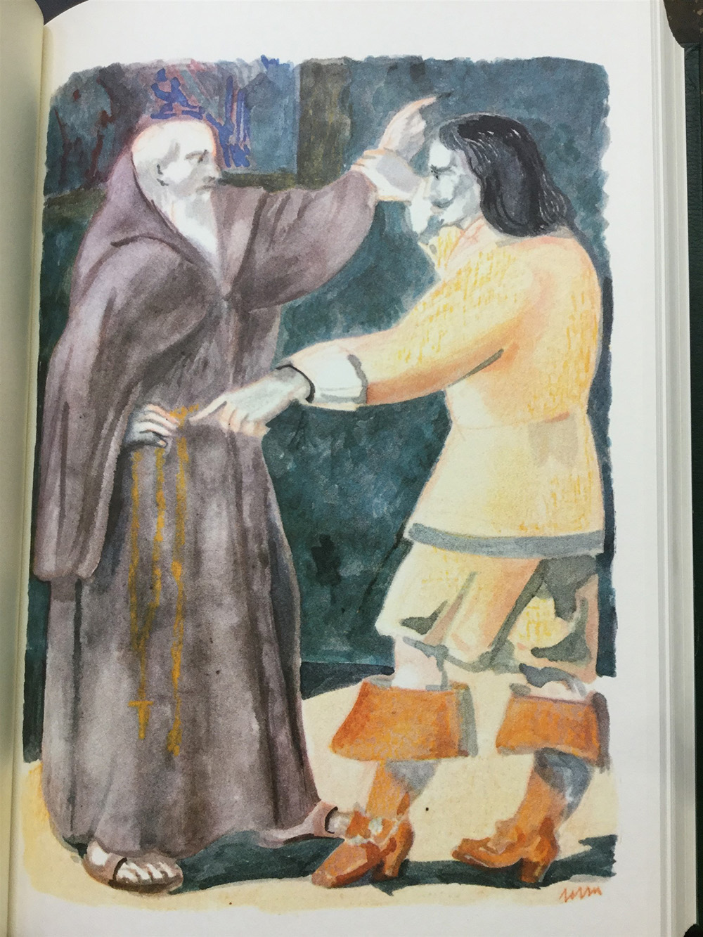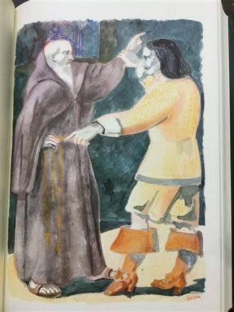 SASSU, Aligi. Alessandro Manzoni. I Promessi Sposi. Roma: Edizioni d'Arte, 1982. Esemplare 749/1999, con tavole a colori stampate con procedimento litografico. Copia firmata al colophon dall'artista e con dedica di Sassu. Legatura in piena pelle di colore verde, con autore e titolo impressi in oro al dorso. Entro custodia rigida in cartone.