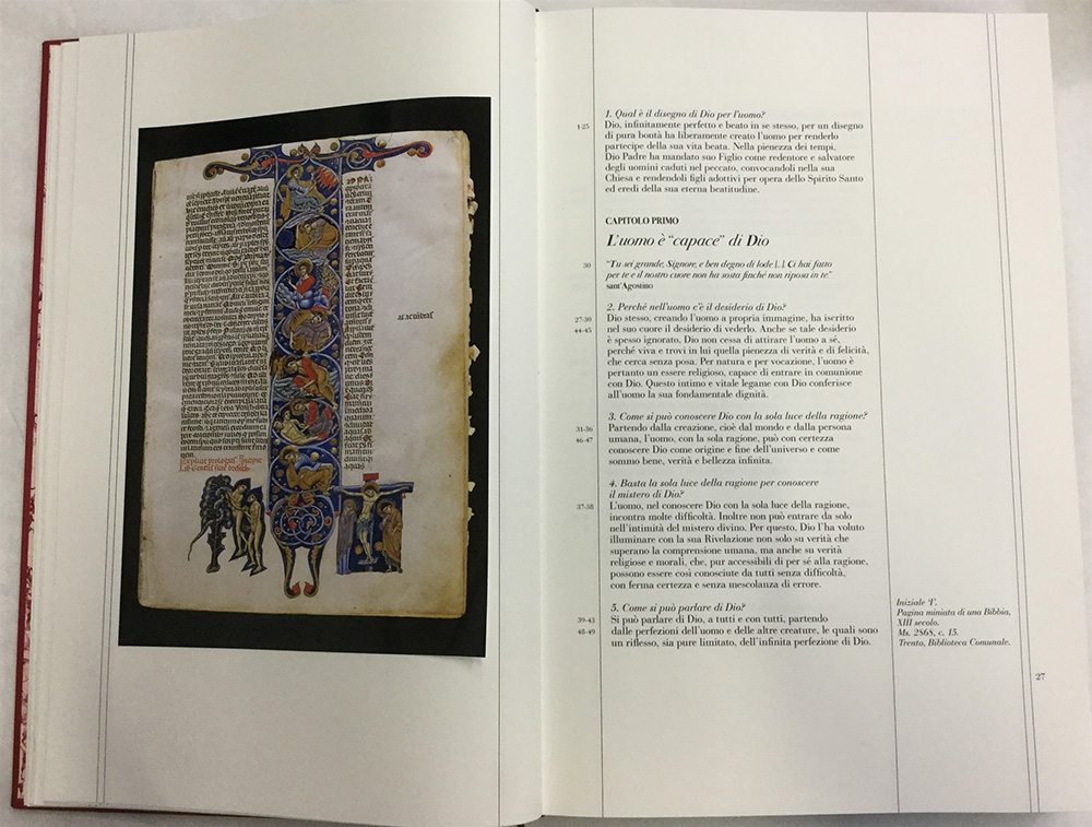Catechismo della Chiesa Cattolica. Compendio. Bologna: Art'è, 2006. Esemplare 1291/3000 di cui 50 contrassegnati da numeri romani, contenente illustrazioni a colori applicate a mano. Legatura in seta Orient porpora con stampa in oro e ricamo con stemma papale in filo d'oro. Entro custodia rigida in cartone marmorizzato. Corredata da certificato di autenticità.