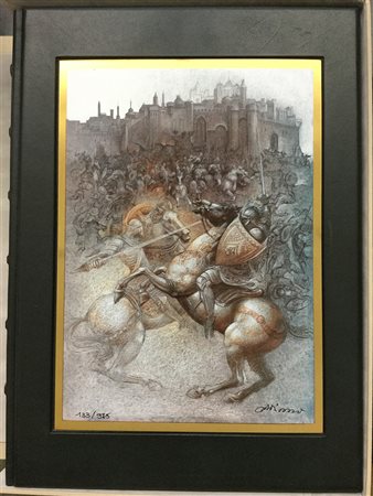 MARCHIONNI, Elvio. Ludovico Ariosto, Orlando Furioso. [s.l.]: Franco Maria Ricci, 2005. Esemplare 133/1050 di cui 75 contrassegnati da numeri romani, con 10 tavole di Marchionni. Copia firmata in lapis dall'artista. Legatura in pelle tinta alla botte con iscrizioni in oro, con una litoserigrafia originale dell'artista, su lastra in ottone ricoperta in oro 24k posta sulla copertina anteriore. Entro cofanetto rigido in piena tela. Corredata da certificato di autenticità