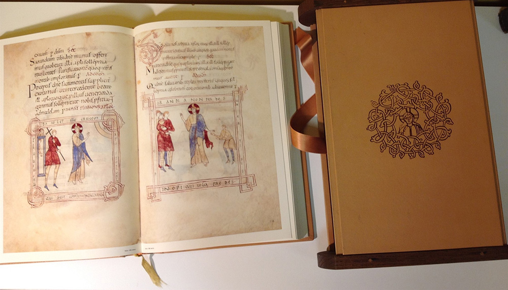 Sacramentarium episcopi Warmundi. Ivrea: Priuli e Verlucca Editori, 1990. Esemplare n. 499/1000, anastatica a colori stampata in occasione della visita alla Diocesi di Ivrea di Giovanni Paolo II. Legatura in piena pelle naturale con impressioni a secco ai piatti e al dorso. Cofanetto in piena pelle con basi in legno.