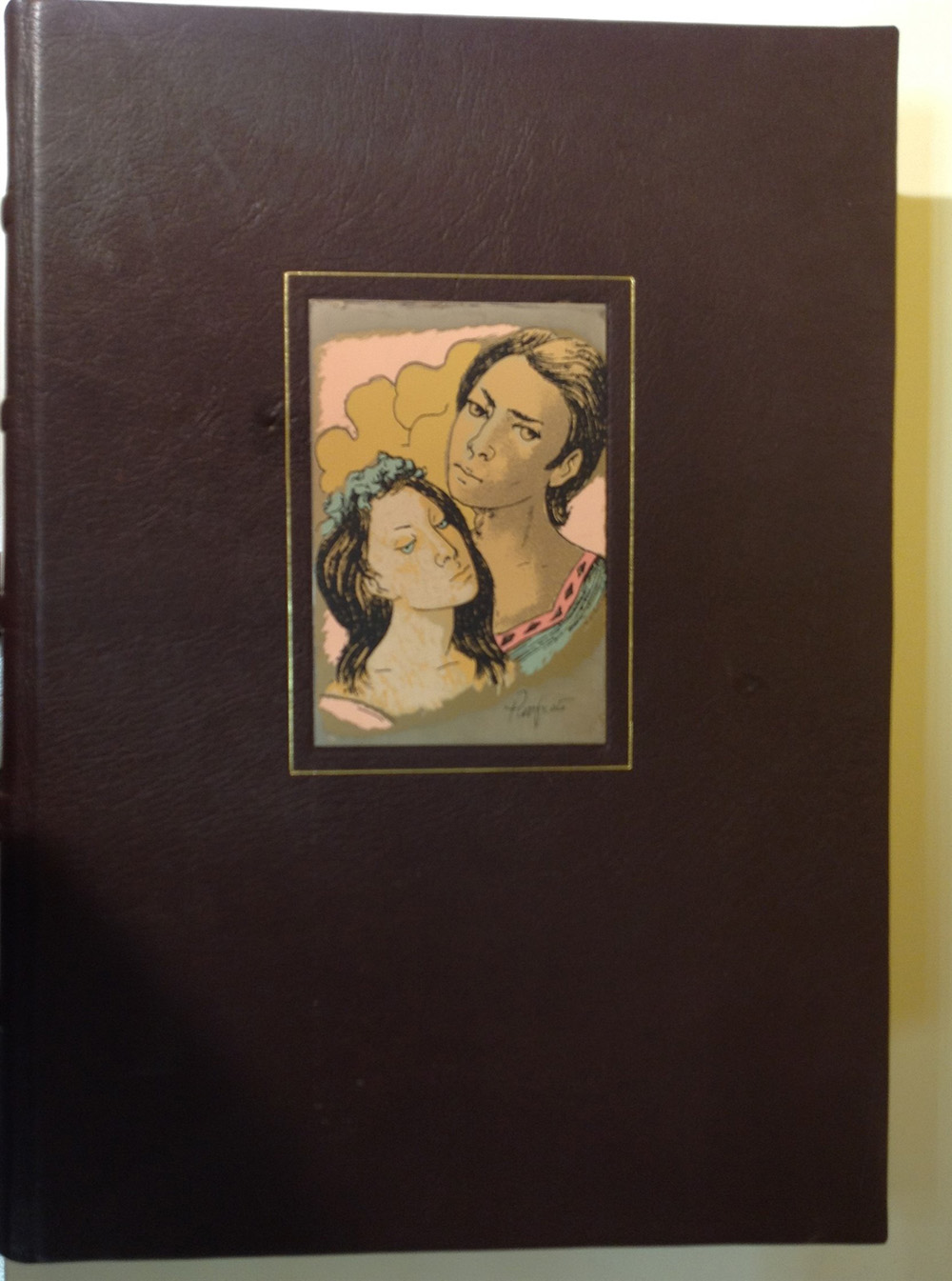 SHAKESPEARE, William. Romeo e Giulietta. Roma: Istituto Poligrafico d'arte classica e contemporanea & Unione italiana per il collezionismo d'arte. Esemplare n. 264/990. Traduzione del testo originale a cura di Salvatore Quasimodo, contenente dieci litografie a colori. Legatura in piena pelle marrone con al centro una serigrafia su lastra in oro o in argento. Base in legno.