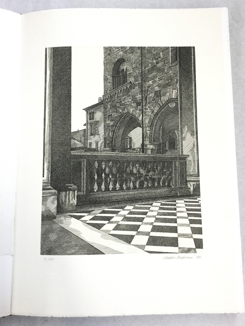 Cara Bergamo. Dieci acqueforti di Attilio Stefanoni. Bergamo: Grafica e Arte Bergamo, 1984. Volume in folio grande, con dieci acqueforti originali firmate e numerate dall'artista. Esemplare 48/125. Legatura in piena pelle, entro cofanetto.