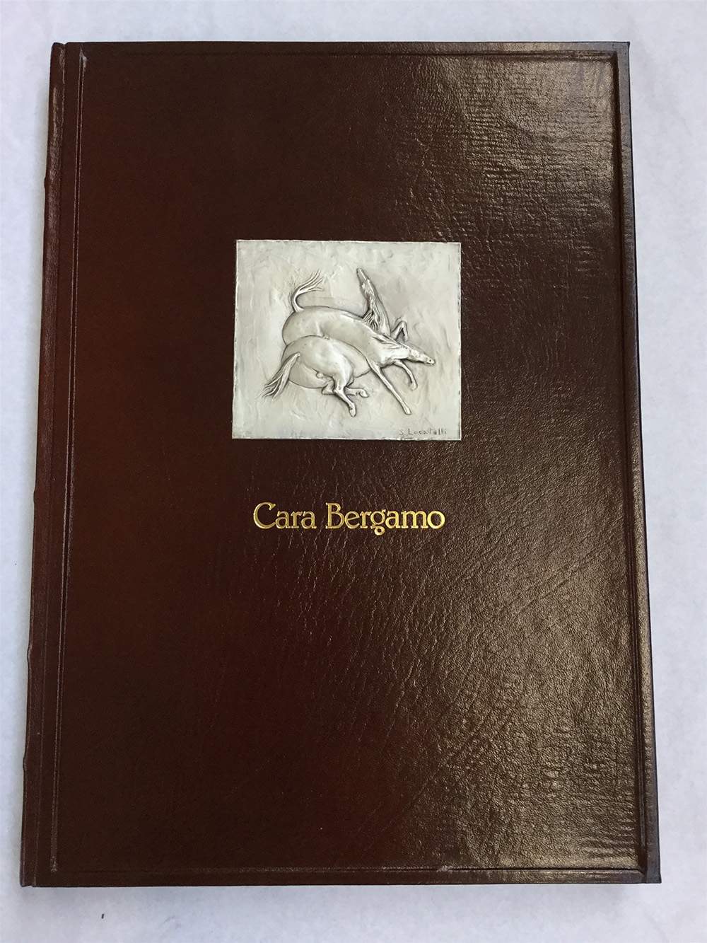 Cara Bergamo. Dieci litografie di Stefano Locatelli. Testi di Luigi Chiodi. Bergamo: Grafica e Arte Bergamo, 1982. Volume in folio grande, con dieci litografie firmate dall'artista. Esemplare 102/199. Legatura in piena pelle con bassorilievo in rame argentato eseguito da Locatelli, entro cofanetto.