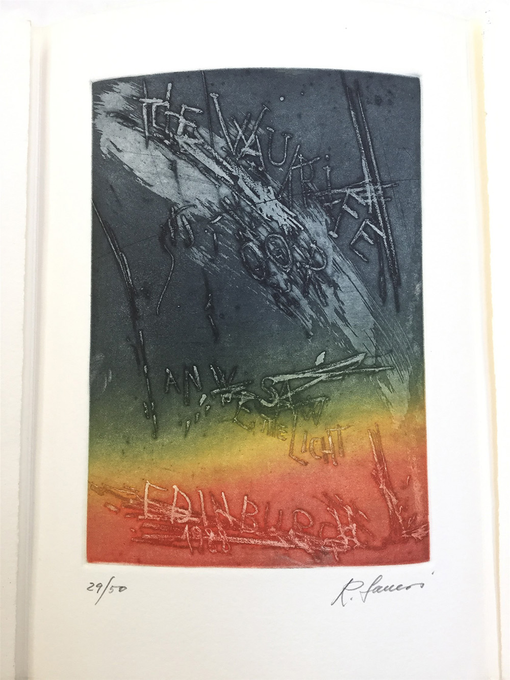 SANESI, Roberto. Four Poems. Milano: Grafica Uno - Giorgio Upiglio, 1988. Esemplare 29/50, firmato dall'autore, con acquaforte a colori. 4to. Legatura editoriale cartonata.