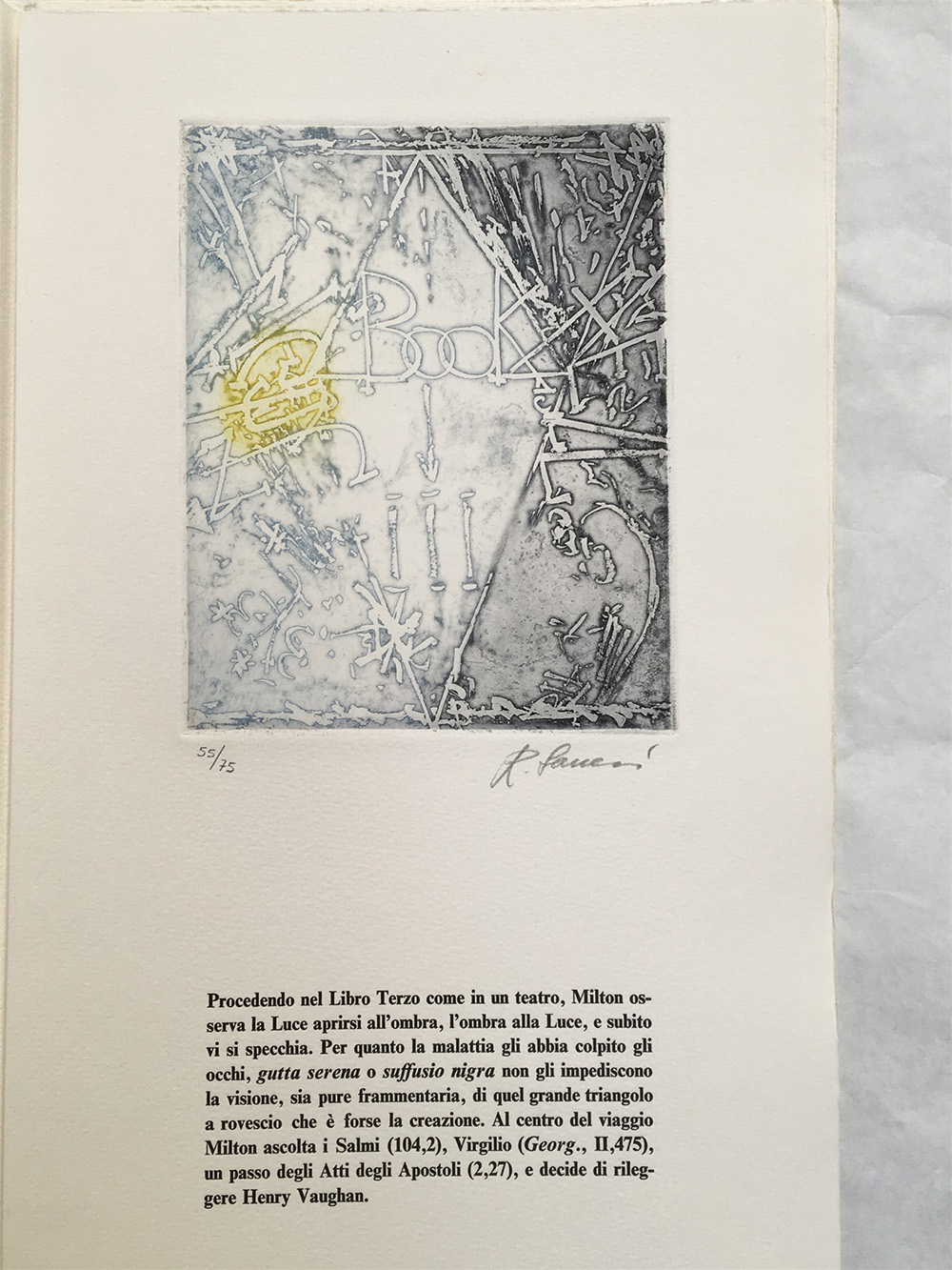 SANESI, Roberto. Milton. Milano: Grafica Uno - Giorgio Upiglio, 1990. Esermplare 55/85 (di cui 10 contrassegnati con numeri romani), con cinque acquaforti a colori, firmate e numerate dall'artista e tirate sui torchi di Giorgio Upiglio. 4to. Legatura editoriale, entro custodia.