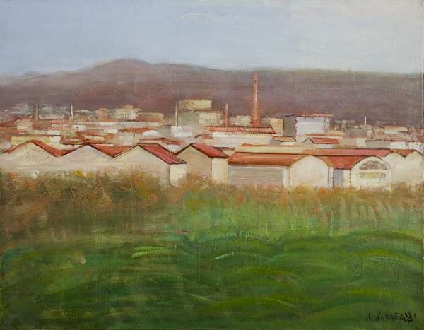 Marcello Andreozzi Piazza Carlo Marx olio su tela cm. 70x90 Firma in basso a dx