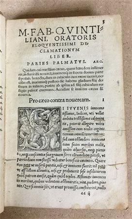 QUINTILIANO, Marco. Oratoris eloquentissimi. Lione: Simone Vincenzi, 1538. Volume in 8vo in lingua latina, con iniziali xilografiche e annotazioni manoscritte posteriori (gora d'acqua alla fine del libro). Legatura in cartone.