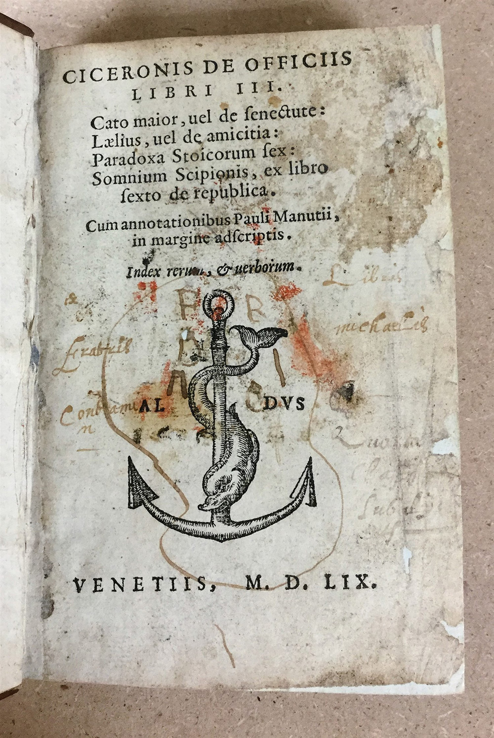 CICERONE, Marco Tullio. De Officis libri tres. Venezia: Paolo Manuzio, 1559; Volume in 8vo in latino con il marchio tipografico dell'editore al frontespizio. Legatura in mezza pelle.