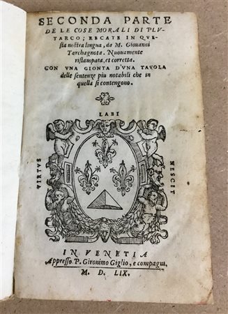 TARCHANIOTA, Giovanni (trad.). Seconda Parte delle cose Morali di Plutarco. Venezia: P. Gironimo Giglio e compagni, 1559. Volume in 8vo (la pagina 289 è stata sostituita da una fotocopia). Legatura in mezza pergamena (taglio con segni di umidità).