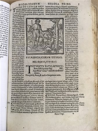 VIRGILIO, Publio Marone. Bucolica, Georgica, Aeneis cum Seruii commentariis accuratissime emendatis. Venezia: in aedibus Aurelii Pincii Veneti, 1531 (al colophon). Vol. in 4to, con marca tipografica di Luca Antonio Giunta al frontespizio e al colophon; bel fregio xilografato al frontespizio; annotazioni manoscritte ai margini (cc. a ii-viii, oo i-viii mancanti e sostituite da fotocopia; gore di umidità e segni di tarli). Legatura in piena pergamena moderna.