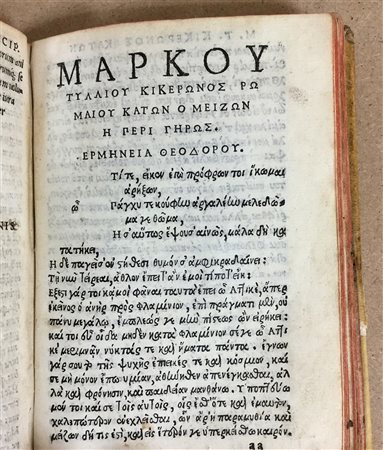 CICERONE, Marco Tullio. De Officis libri tres. Venezia: Giovanni Andrea Vavassore, 1558. Volume in 8vo (le cc. 33 e 34 sostituite da una fotocopia), in latino con il marchio tipografico dell'editore al frontespizio. Al termine del volume è allegato il De Senectute di Cicerone tradotto in greco. Legatura in piena pergamena con taglio di colore rosso (lievi difetti).