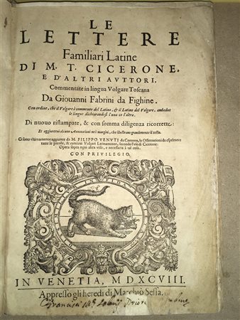 CICERONE, Marco Tullio. Le lettere familiari latine di M. T. Cicerone, e d'altri auttori. Venezia: Marchio Sessa, 1598. Volume in 4to, con in antiporta la marca tipografica dell'editore. Il volume termina con le osservazioni delle epistole dell'autore da parte di Filippo Venuti da Cortona (fioriture). Legatura in pergamena; nota di possesso alla prima carta di guardia di Vincenzo Solario (rovinata).