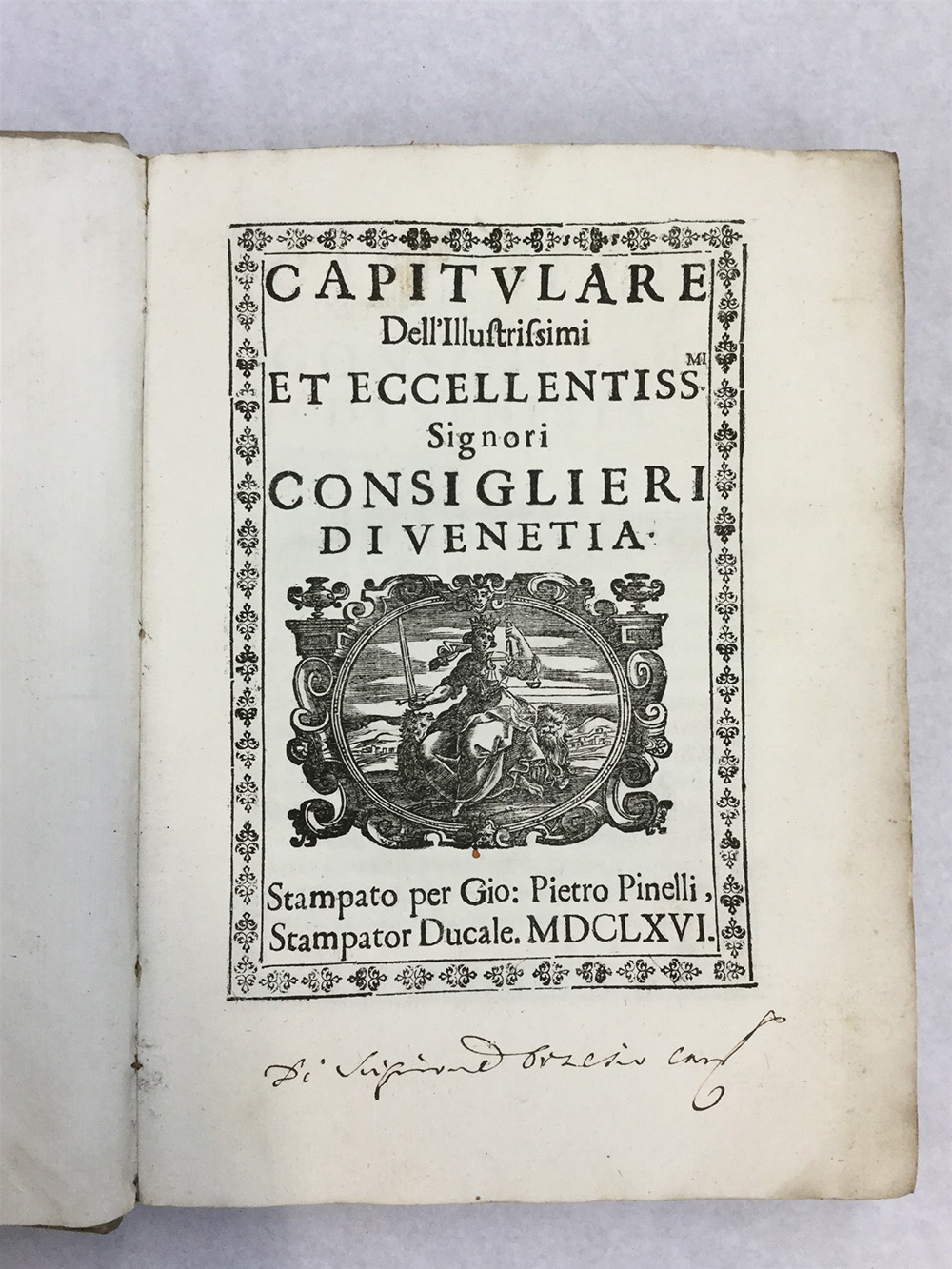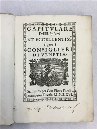 Capitulare dell'Illustrissimi et eccellentissimi signori consiglieri di Venetia. Venezia: Pietro Pinelli, 1666.Vol. in 4to, teso entro elaborat cornici xilografiche e iniziali istoriate e decorative. Legatura in pergamena coeva.