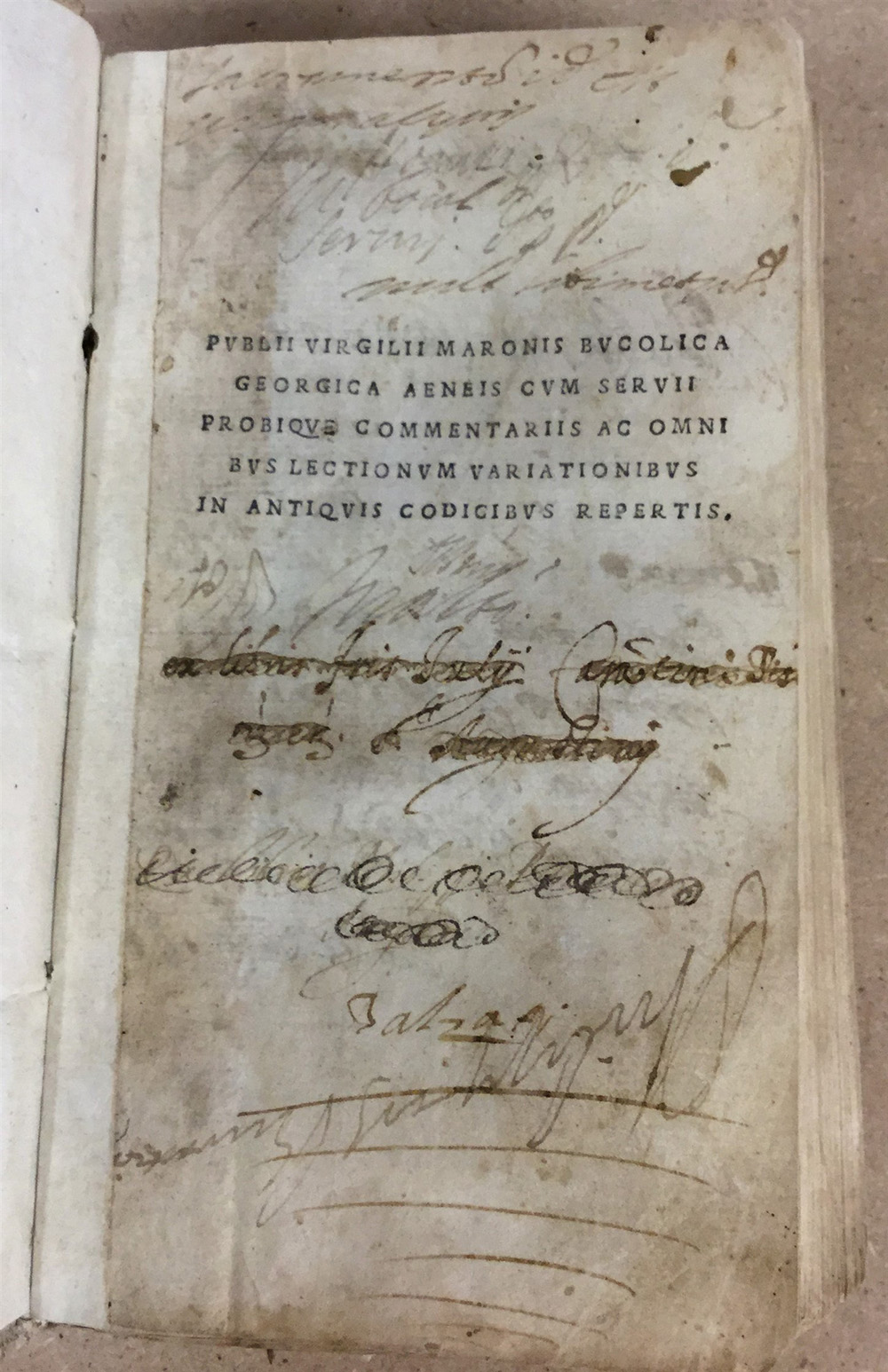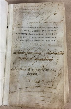 VIRGILIO MARO, Publio (70-19 A.C.) - Bucolica, Georgica, Aeneis, cum Servii Probique commentariis. Venezia: Alessandro Vellutello per Pietro Nicolini da Sabbio, 1534. 8vo (164 x 93mm). Cartone del XVIII secolo (difetti).