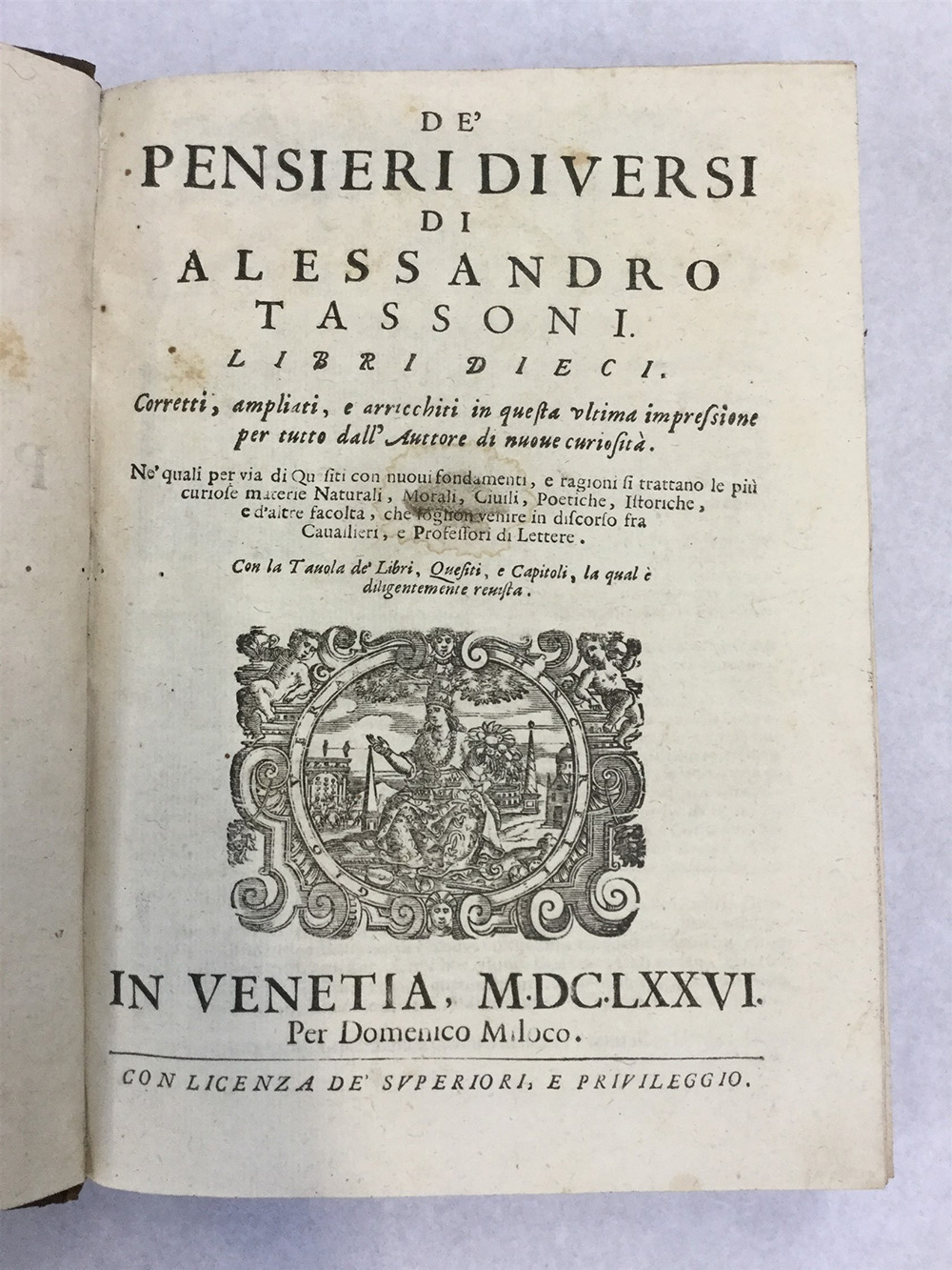 TASSONI, Alessandro. De' pensieri diversi. Venezia: Domenico Milocu, 1676....
