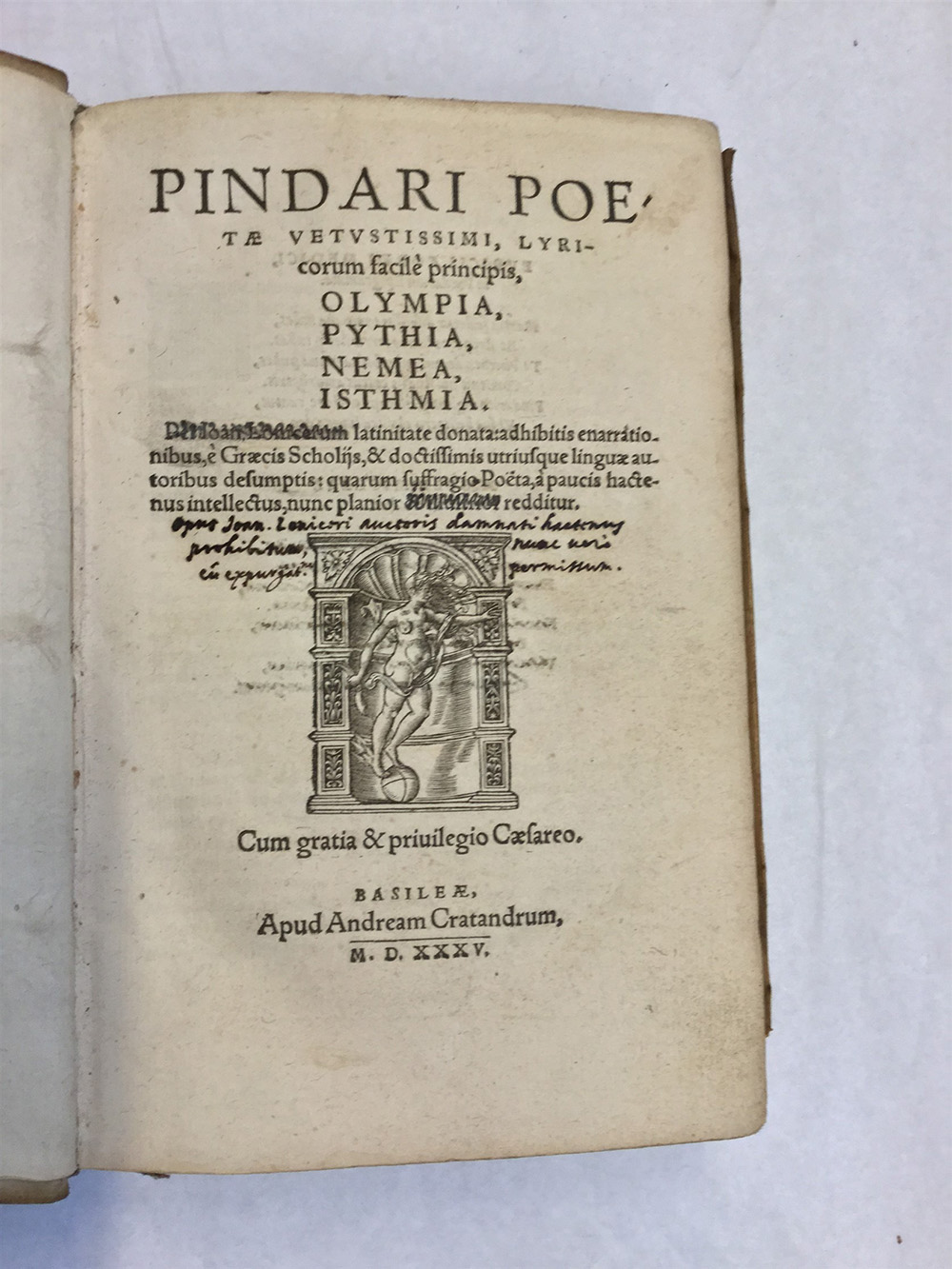 PINDARO. Olympia Pythia Nemea Isthmia per Ioan. Leonicerum latinitate donata. Basilea: Giovanni Catandro, 1535. Vol. in 4to, con marca tipografica al frontespizio e in fine, iniziali xilografiche. Legatura in piena pergamena (lievi difetti).