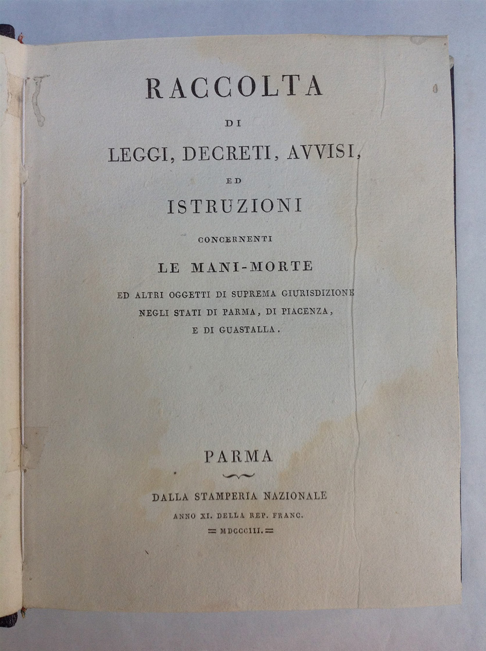 Raccolta di leggi, decreti, avvixi, ed istituzioni concernenti la man-morte ed altri oggetti di suprema giurisdizione negli Stati di Parma, di Piacenza, e di Guastalla. Parma: Stamperia Nazionale, 1803. Volume in 4to piccolo contenente leggi, editti e notifiche (gore di umdità). Legatura in mezza tela.