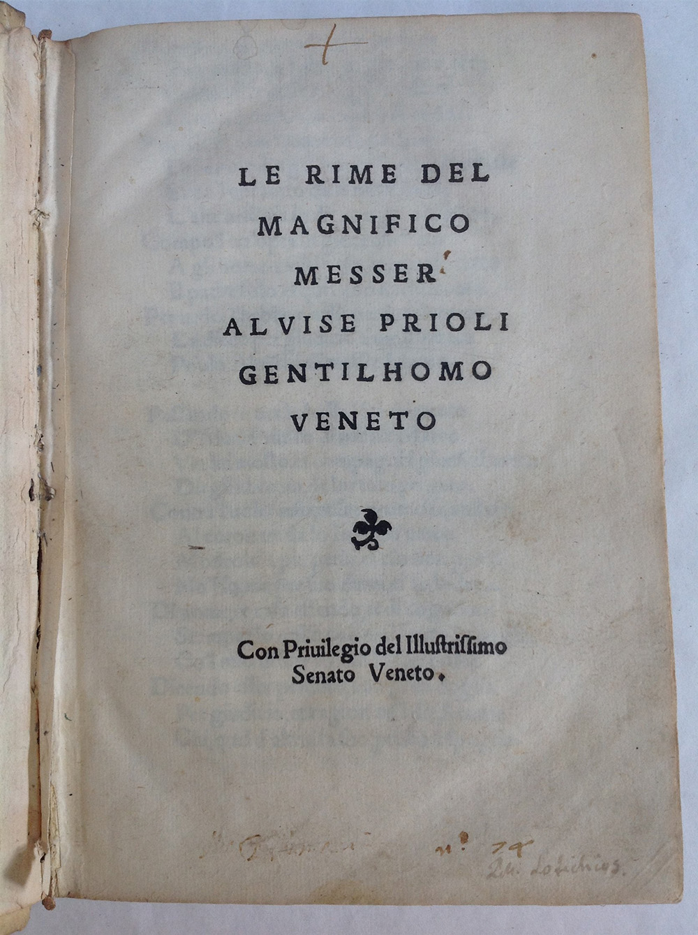 PRIOLI, Alvise. Le rime. Venezia: 1533. Volume in 4to contenente le poesie...