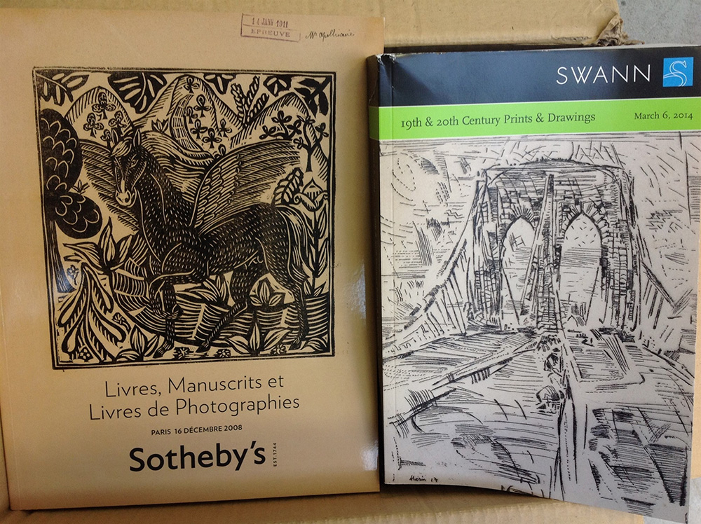 Lotto contenente 35 cataloghi d'arte moderna e contemporanea (incisioni, disegni, quadri e libri), per lo più africana e americana della Swann Gallery di New York. In cartone.