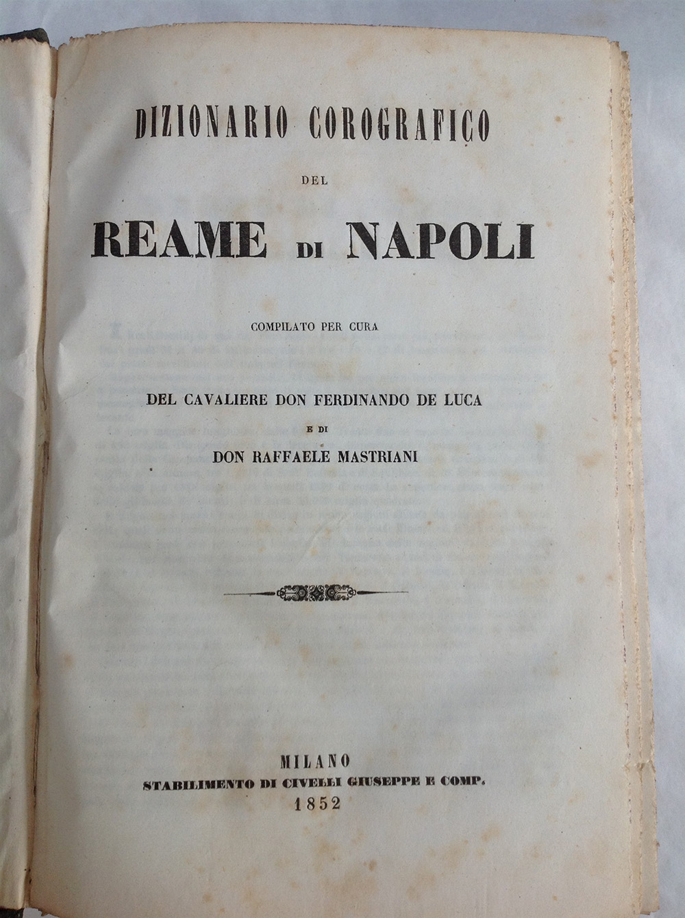 DE LUCA, Ferdinando. Dizionario corografico del Reame di Napoli. Milano: Giuseppe Civelli e comp., 1852. 2 volumi in 4to con testo su due colonne in ordine alfabetico (fioriture). Legatura in mezza pelle verde (dorsi leggermente rovinati).