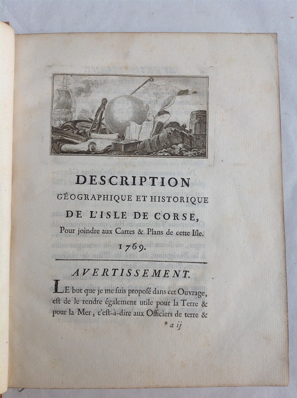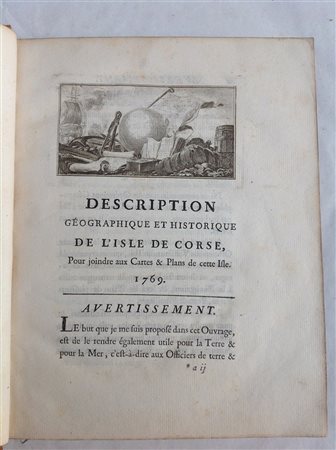 BELLIN, Giovanni Nicola. Description geographique et historique de l'isle de Corse. Parigi: Didot, 1769. Volume in 4to con marchio tipografico al frontespizio e incisione nella prima pagina (lievi fioriture). Legatura in pelle con decori in oro lungo i piatti a al dorso (dorso quasi del tutto cancellato e parte di pelle mancante ai dorsi).
