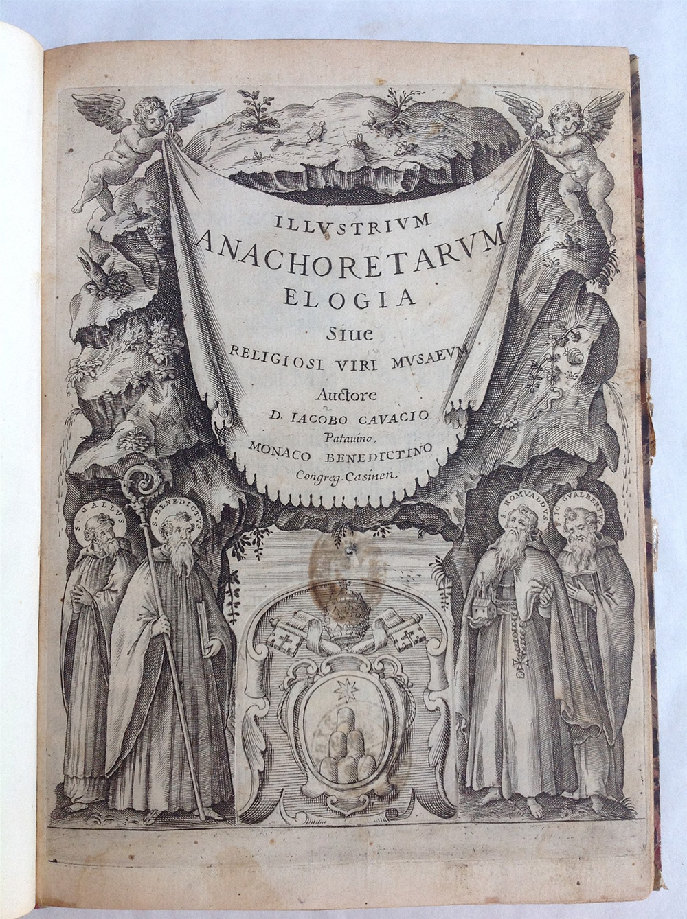 CAVACIO, Giacomo. Illustrium anachoretarum elogia. Roma: Dragondelli, 1661. Volume in 4to con incisione al frontespizio. Lettere iniziali xilografiche e numerose figure incise in rame a piena pagina (fioriture e bruniture). Legatura in mezza pelle con decori in oro al dorso.