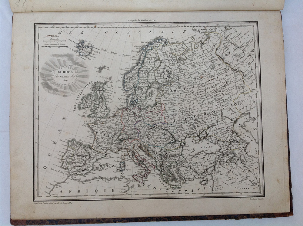 MALTE-BRUN, Conrad. Precis de la geographie universalle ou description de toutes les parties du monde. Parigi: Buisson, 1810. Volume in-folio piccolo. Atlante geografico con 24 carte geografiche a colori incise (fioriture). Legatura in mezza pelle (piatto anteriore in parte staccato dal volume).