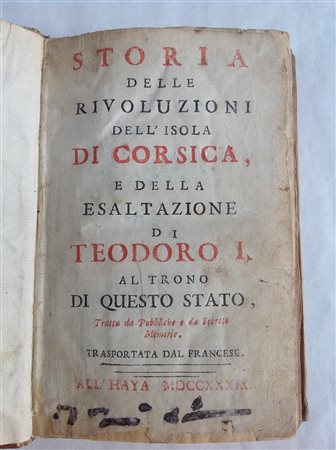 Storia delle rivoluzioni dell'isola di Corsica, e della esaltazione di Teodoro I al trono di questo Stato. All'Haya, 1739. Volume in 8vo con titolo al frontespizio in nero e rosso (bruniture e gore di umidità). Legatura in piena pergamena.