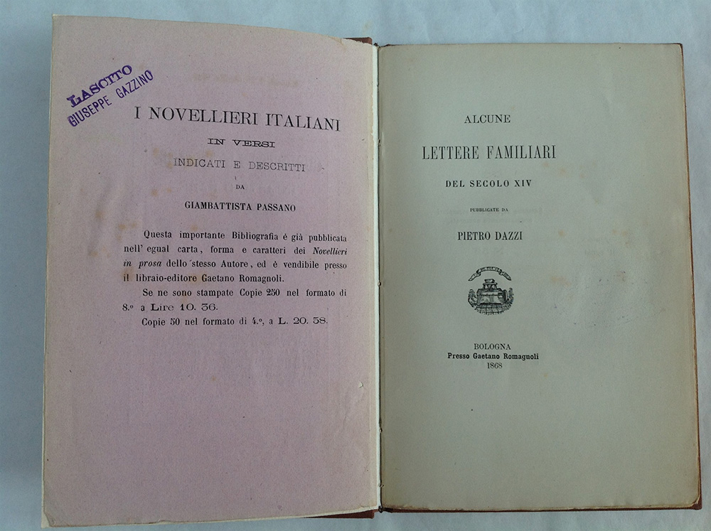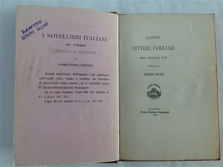 DAZZI, Pietro. Alcune lettere familiari del secolo XIV. Bologna: Gaetano...