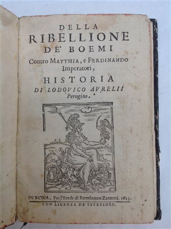 AURELI, Ludovico. Della ribellione de Boemi. Roma: Zanetti, 1625. Volume in 8vo con marchio tipografico dell'editore al frontespizio. Iniziali xilografiche. In alcune pagine appunti manoscritti (fioriture). Legatura antica in mezza pelle (rovinata).