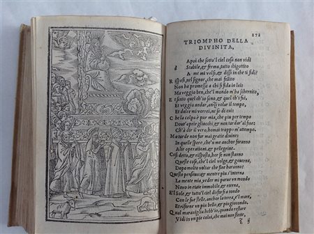 PETRARCA, Francesco. Canzoniere e trionfi. Venezia: Bindoni, 1542. Volume in 8vo con ritratto dell'autore al frontespizio. Figure a piena pagina ai trionfi (fioriture). Legatura in piena pergamena.