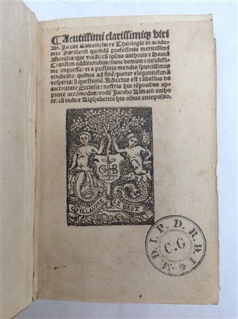 ALMAIN, Giacobbe. Moralia. Parigi: Barisio, 1526. Volume in 8vo con iniziali xilografiche (fioriture e bruniture). Legatura in piena pergamena (macchie).