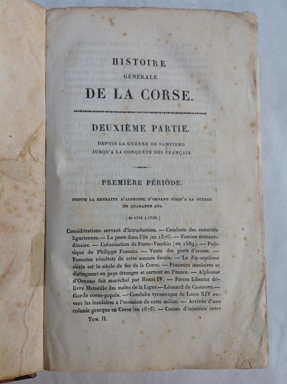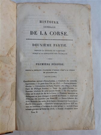 JACOBI, Giuseppe Maria. Histoire generale de la Corse. Parigi: Bellizard, Barthes, Dufoue e Lowell, 1835. 2 volumi in 8vo (fioriture e gore di umidità). Legatura antica in cartone.