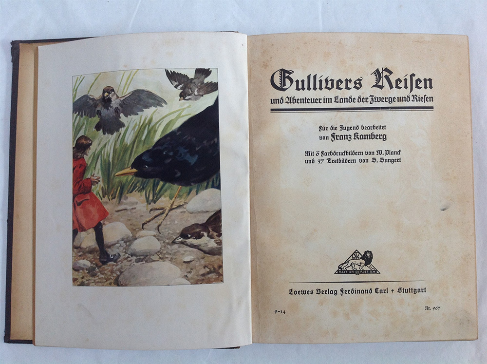 KAMBERG, Franz. Gullivers reisen. Stoccarda: Loemes Verlag Ferdinand Carl, [s.d.]. Volume in 8vo. Libro per bambini in tedesco con numerose illustrazioni in bianco e nero e a colori. Legatura editoriale in cartone con figura a colori.