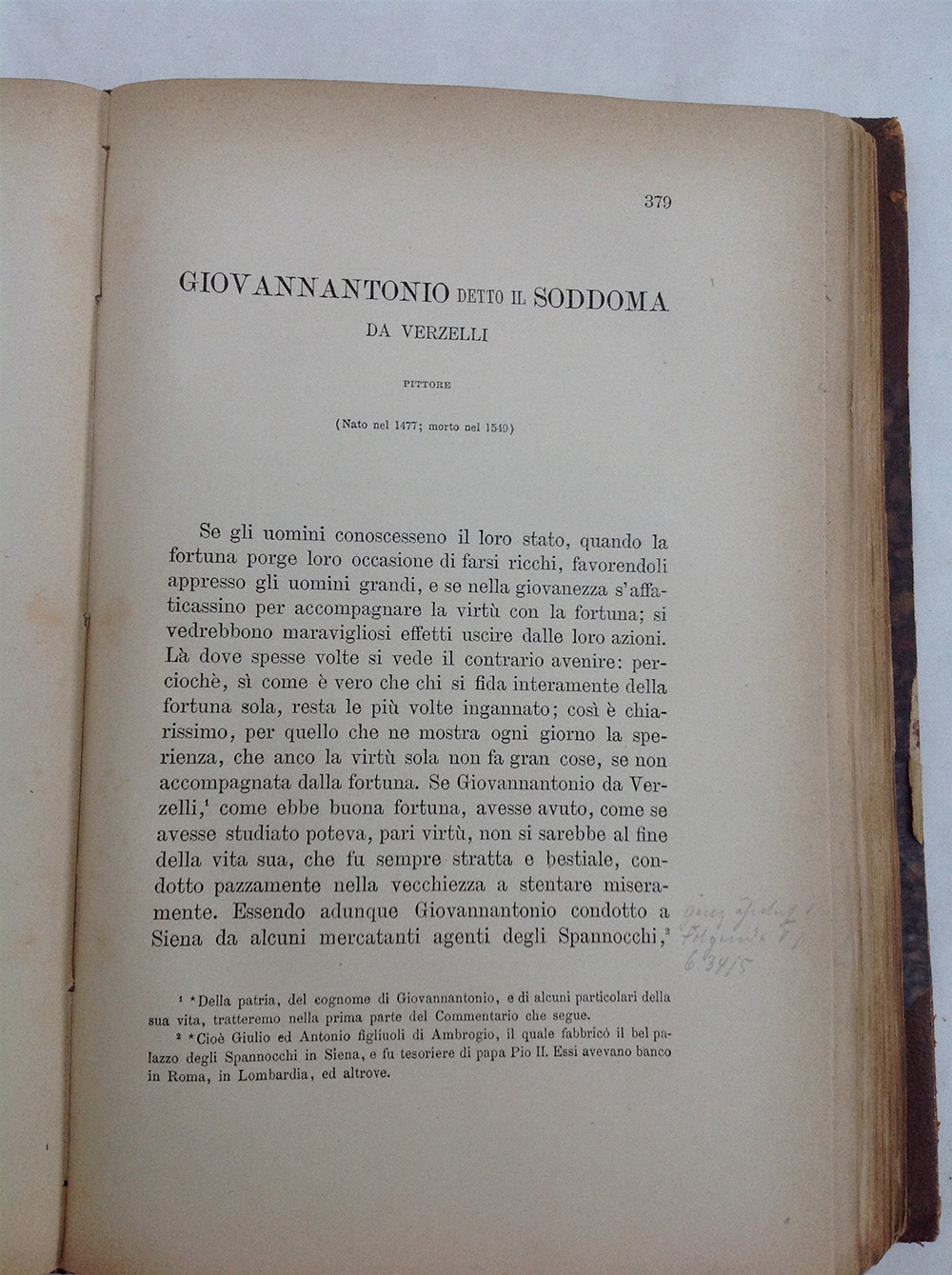 VASARI, Giorgio. Le vite de' più eccellenti pittori scultori ed architetti con nuove annotazioni e commenti di Gaetano Milanesi. Firenze: Sansoni, 1878-1885. 9 volumi in 8vo grande. Numerose postille, note e aggiunte manoscritte manoscritte su fogli acclusi (fioriture). Legatura in mezza pelle (dorsi staccati).