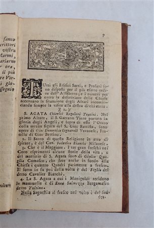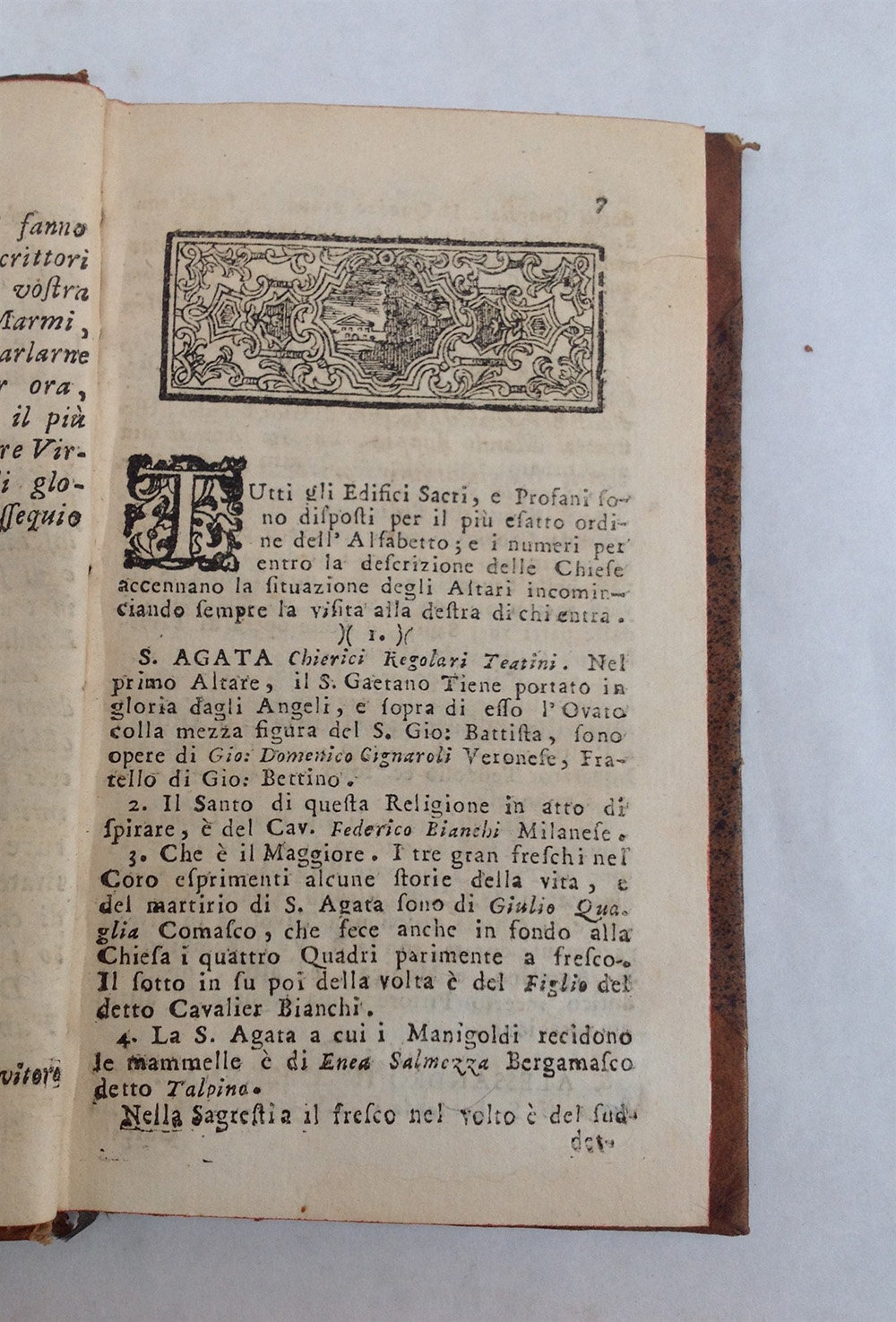BARTOLI, Francesco. Le pitture sculture ed architetture delle chiese, e d'altri luoghi pubblici di Bvergamo. Vicenza: Carlo Bressan, 1764. Volume in 12mo con marchio tipografico dell'editore al frontespizio (fioriture e bruniture). Legatura in mezza pelle con decori in oro al dorso. Taglio di colore rosso.