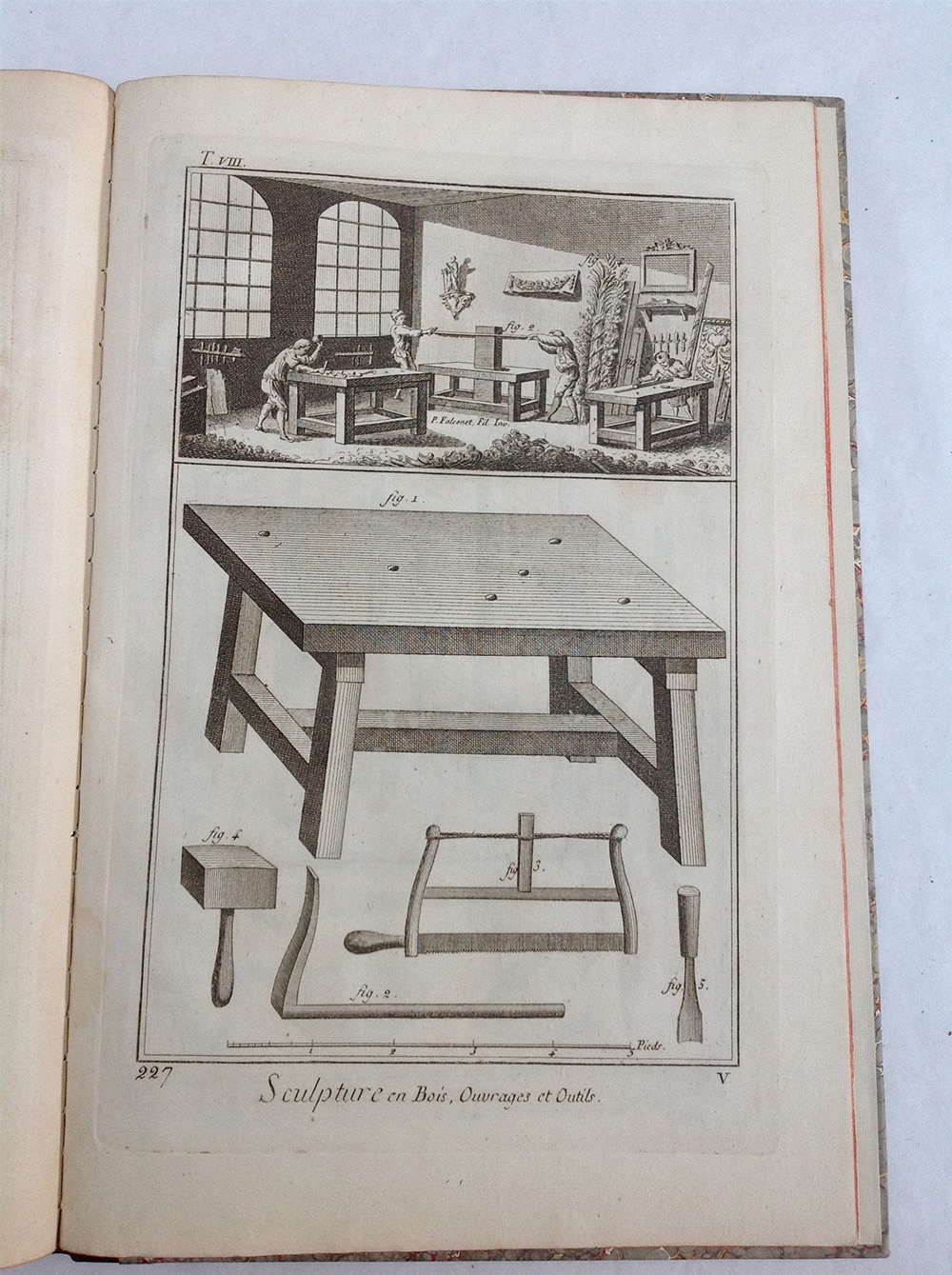 DIDEROT, Denis. Sculpture en tous genres. Parigi: 1770. Volume in folio con 24 tavole raffiguranti vari utensili e macchine da lavoro (Fioriture e bruniture). Legatura in mezza pelle.