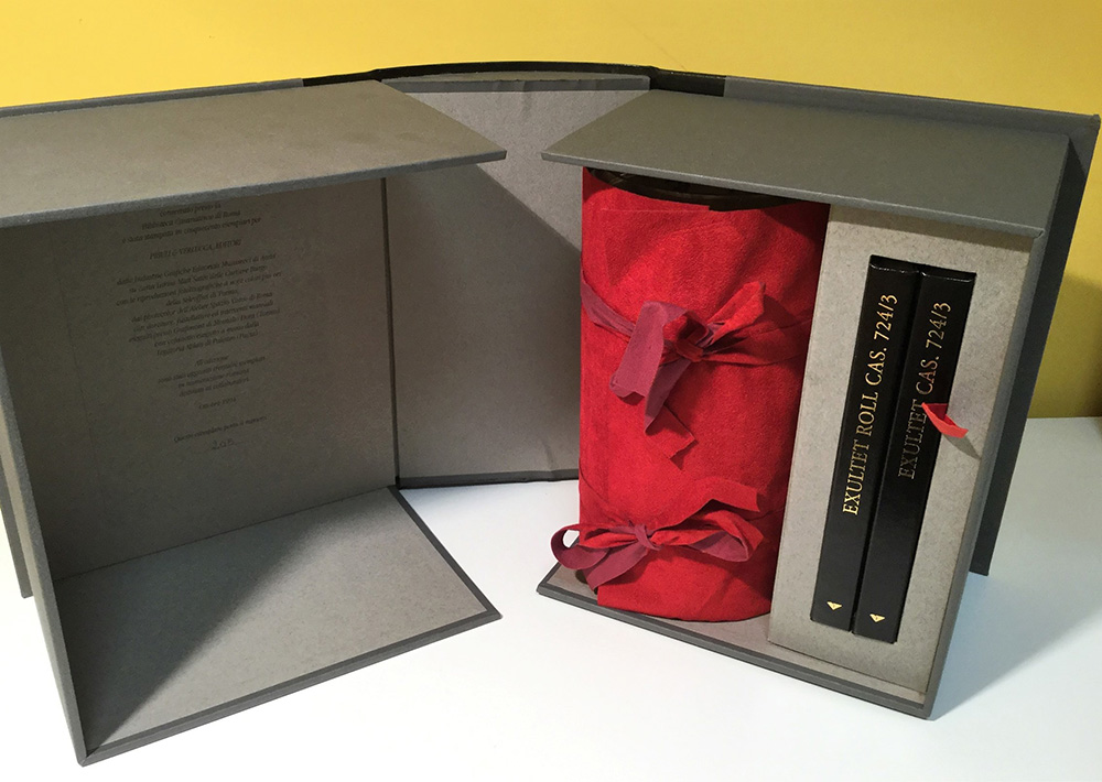 CAVALLO, Guglielmo (cur.). Exultet Roma, Biblioteca Casanatense, Cas. 724 [B.I.13] III. Pavone Canavese: Priuli & Verlucca editori, 1994. Riproduzione facsimilare del rotolo del secolo XII conservato presso la Biblioteca Casanatense; la lunghezza totale del facsimile è di circa 7 metri. Corredato di commentario in italiano e in inglese. Entro cofanetto eseguito a mano. Esemplare 205/500.